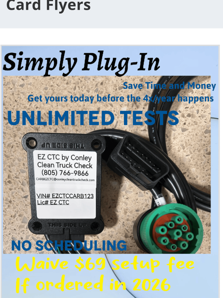 NOW OFFERED EZ CTC CONTINUOUS DEVICE RENTALS. FOR OBD TESTS ON YOUR SCHEDULE, UNLIMITED TEST, AS NEEDED. FOR A LIMITED TIME WERE WAIVING OUR SETUP FEE. NO TIME FOR SCHEDULING, NO PROBLEM!! FOR 2013+ ENGINES THAT NEED AN OBD TEST. Get yours before this $69 dollar charge expires. Testing increases in October 2027 to 4x a year. ASK ABOUT THE EZ CTC NOW, BY CONLEY CLEAN TRUCK CHECK- FOR ALL YOUR CLEAN TRUCK CHECK NEEDS!! (805) 766-9866